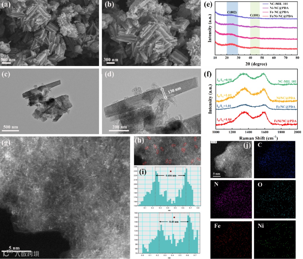 Fig. 1. SEM images of a), b) Fe/Ni-NC@PDA. TEM images of c), d) Fe/Ni-NC@PDA. e) XRD and f) Raman spectra of N Fe/Ni-NC@PDA and other comparison catalysts. g), h) Aberration-corrected HAADF-STEM images of Fe/Ni-NC@PDA. i) The corresponding diatomic distances marked in h). j) HAADF-STEM image and elemental mapping images.