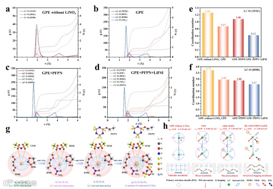 通过径向分布函数(RDF)和配位数(CN)分析揭示了Li⁺配位环境的演变规律。通过NO3-的强配位作用、PFPN与TFSI-的分子间相互作用,以及FSI-与TFSI⁻-NO₃⁻形成的多阴离子高熵效应,使Li⁺-TFSI⁻/溶剂的配位逐渐减弱,导致第一溶剂化壳层的体积逐渐增大,Li+的传导机制由在第一溶剂化壳层的定向迁移逐步演变为Li+在不同位点之间的跳跃传导,进而导致锂离子迁移数逐步提高。