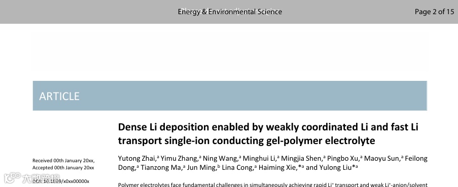 Yutong Zhai, Yimu Zhang, Ning Wang, Minghui Li, Mingjia Shen, Pingbo Xu, Maoyu Sun, Feilong Dong, Tianzong Ma, Jun Ming, Lina Cong, Haiming Xie, and Yulong Liu, Dense Li deposition enabled by weakly coordinated Li and fast Li transport single-ion conducting gel-polymer electrolyte. Energy Environ. Sci., 2025. (Accepted Article)