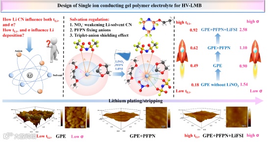 随着全球新能源汽车的迅猛发展,高压锂金属电池(HV-LMB)的研发近年来备受瞩目。作为HV-LMB的核心组件,电解质的开发仍面临重大挑战,即:无法平衡弱Li⁺-溶剂/阴离子配位(高锂离子迁移数tLi⁺)与快速Li⁺传输(高离子电导率),这二者共同影响了锂沉积行为。研究表明,较弱的Li⁺-溶剂/阴离子配位作用有助于阴离子进入初级溶剂化鞘层,从而形成致密锂沉积和稳定的无机-有机复合固态电解质界面(SEI);而快速的锂离子传输能有效降低锂沉积势垒,实现具有更多成核位点的平整沉积。然而,高溶剂化电解质(液态电解质,LE)虽具有较高离子电导率(~10 mS cm⁻¹),但锂离子迁移数(tLi⁺ <0.4)偏低,易导致多孔锂沉积和枝晶生长;而弱溶剂化电解质(固态聚合物电解质,SPE)虽具备较高tLi⁺(>0.8),却因离子电导率不足(<0.1 mS cm⁻¹)仅能在低电流密度(<0.5 mA cm⁻²)下工作。针对这一关键科学问题,本研究创新性地提出通过有序溶剂化结构调控策略,设计开发了单离子导电凝胶聚合物电解质(SIC-GPE+PFPN+LiFSI),突破了传统强配位电解质的理论局限。