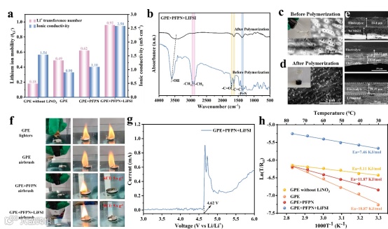 图2. 通过进行离子电导率、锂离子迁移数、LSV、SEM、FT-IR等测试对电解质的电化学性能进行表征。