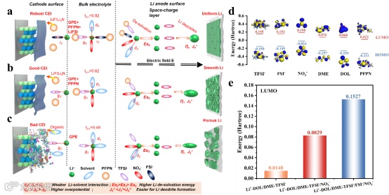 根据上述结果,进一步通过界面模型和DFT对正负极界面进行分析。在负极侧,对于图7a的单离子导聚合物电解质(SIC-GPE+PFPN+LiFSI电解质),其锂离子迁移数和极限电流密度的提高,可有效地消除空间电荷效应,使锂沉积更容易,形成光滑致密的锂沉积。而对于图7b-c锂离子迁移数低的电解质(GPE+PFPN和GPE电解质),其沉积过电势的提高和极限电流密度的降低导致其形成松散的球形锂沉积。对于正极侧,在GPE电解质中,由于Li+的弱配位,游离溶剂可以很容易迁移到阴极表面,导致在正极侧形成有机CEI,而加入PFPN后,由于PFPN的HOMO低,可以提高电解质的抗氧化能力,使之兼容高电压NCM622正极。
