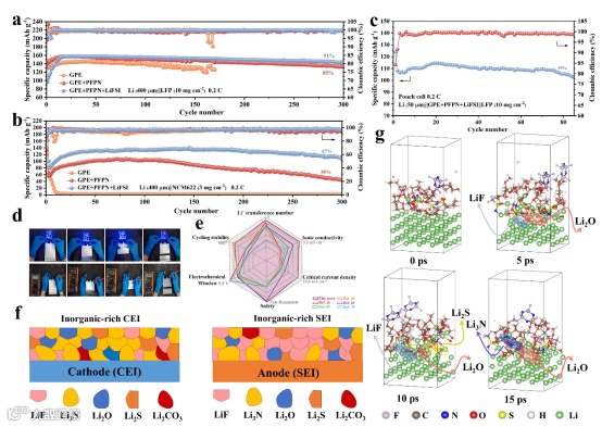 为了验证该电解质的长循环性能,使用高载量(10 mg cm-2)的LFP正极组装全电池进行测试,在0.2C倍率下循环300圈容量保持率为91%。而在匹配高电压的NCM622正极时,传统的GPE电解质无法兼容NCM622正极,而在对电解质进行优化之后(GPE+PFPN+LiFSI),循环300圈容量保持率为87%。此外,使用高负载LFP正极(10 mg cm-2)和50 μm超薄锂负极组装的袋式电池, 经过85次循环后容量保持率为95%。并且,对其进行机械滥用测试(如180°弯曲、折叠和切割),电池在极端机械滥用条件下仍保持稳定的电压输出,并成功点亮商用蓝色LED灯。进一步通过XPS、AIMD等对其界面进行分析,该电解质在循环后在正负极界面均富含LiF、Li3N等稳定的CEI和SEI。