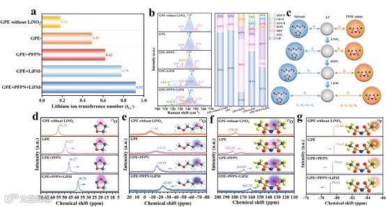 图3. 通过核磁和拉曼分析溶剂化效应对锂离子迁移数的影响机制。