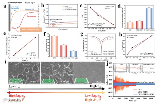通过不同模型分析锂离子迁移数对锂沉积行为的影响。根据Chazalviel的空间电荷模型,发现Li⁺浓度的增加可以显著促进锂离子的传输,并限制空间电荷层中的离子耗尽,从而降低锂成核的能量和障碍; 当空间电荷区中的阴离子浓度接近零时,观察到锂枝晶的生长。通过Sand拟合发现增加tLi+可以大大降低高电流密度下枝晶形成的危险。特别是,SIC-GPE+PFPN+LiFSI电解质中完全的阴离子固定有效抑制了阳极界面的空间电荷极化,从而显著提高了极限电流密度(J*)。在锂成核之后,锂沉积优先发生在现有成核位置附近。通过使用Tafel方程进行拟合,发现增加tLi+会直接提高交换电流密度(i0),从而影响Li沉积过程中的沉积过电位(ηd)。 因此,具有更高tLi+的电解质表现出更快和更容易的沉积动力学,导致光滑且致密的Li沉积形态。
