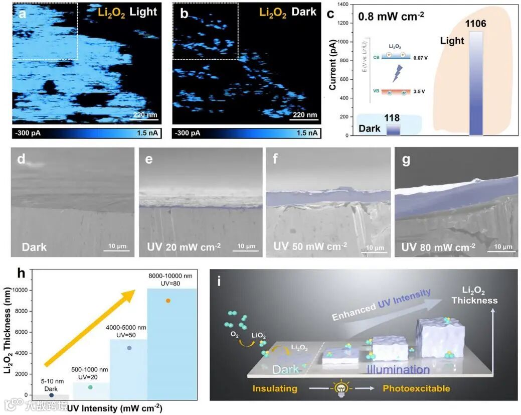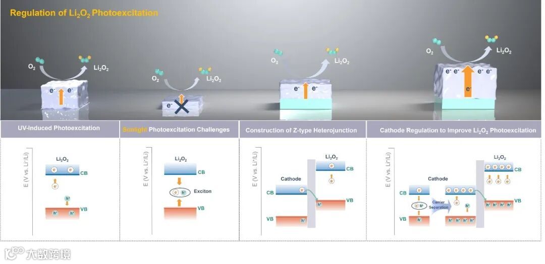 示意图1. Li2O2的光激发及通过光阴极设计增强其激子解离的策略。