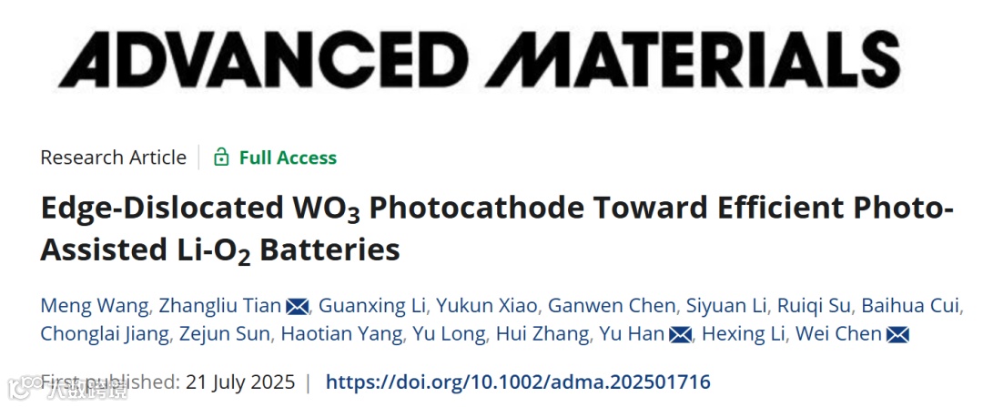 近日,新加坡国立大学陈伟团队&KAUST/华南理工大学韩宇团队合作,在国际知名期刊 Advanced Materials 上发表题为 “Edge-Dislocated WO3 Photocathode toward Efficient Photo-Assisted Li-O2Batteries” 的研究论文。该工作围绕Li-O2电池中放电产物Li2O2的本征绝缘性问题,提出构建光阴极@Li2O2 Z型异质结的全新策略。通过调控光阴极载流子分离行为,增强Li2O2中的激子解离效率,从而突破其本征绝缘性对反应动力学的限制,实现高容量与低极化的兼得。