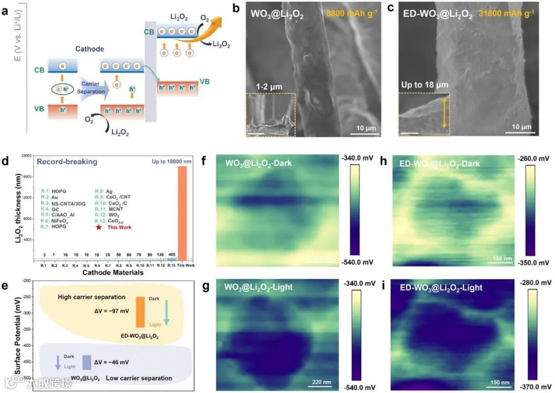 基于上述刃位错增强的载流子分离性能,构建了ED-WO3@Li2O2异质结并评价其对Li2O2激子解离的促进效果。开尔文探针力显微镜(KPFM)对光暗下的表面电势测试结果显示, 在光照下,ED-WO3@Li2O2的表面电势下降幅度(-97 mV)远大于WO3@Li2O2(-46 mV),说明ED-WO3光阴极对Li2O2激子解离的显著促进。这种效应有效促进了放电过程中Li2O2膜的持续沉积,SEM结果显示其生长厚度可达18 μm。