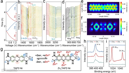 通过原位 FTIR 和 DFT 分析证实,TAPZ-Ni 的锌离子存储位点包括 C=N、N-H 基团及激活的苯环。放电过程中,C=N 基团发生还原反应,苯环的 C=C 键转化为 C-C 键,同时 Zn²⁺与活性位点配位,形成有机 - 无机双活性位点协同存储锌离子的机制。