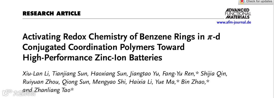 Xiu-Lan Li, Tianjiang Sun, Haoxiang Sun, Jiangtao Yu, Fang-Yu Ren*, Shijia Qin, Ruiyuan Zhou, Qiong Sun, Mengyao Shi, Haixia Li, Yue Ma*, Bin Zhao*, and Zhanliang Tao*. Activating Redox Chemistry of Benzene Rings in π-d Conjugated Coordination Polymers Toward High-Performance Zinc-Ion Batteries. Advanced Functional Materials DOI: 10.1002/adfm.202521605.