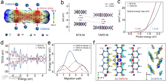 TAPZ 的扩展 π 共轭平面增强了 π-d 共轭效应,显著提升了苯环的 π 电子密度,激活了其锌离子存储能力。DFT 计算表明,TAPZ-Ni 中苯环的 π 电子离域性更强,多中心键序更高,对锌离子的吸附能更低,证实了苯环 redox 活性的激活机制。