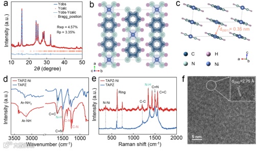 选取具有扩展 π 共轭体系和电活性亚胺基团的 TAPZ 作为有机配体,与 Ni²⁺配位形成 TAPZ-Ni。该材料呈现有序的1D π-π 层状堆叠,相比 BTA-Ni 具有更高的结晶度、更强的分子间相互作用和更优的电子导电性,为良好的电化学性能奠定结构基础。