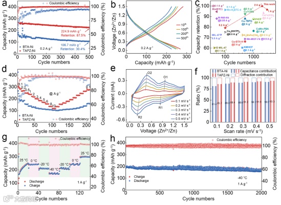 TAPZ-Ni在 0.1 A g⁻¹ 下放电容量达 300.1 mAh g⁻¹,0.2 A g⁻¹ 下循环 500 次容量保持率为 87.5%,10 A g⁻¹ 高倍率下仍有 118 mAh g⁻¹ 的容量。此外,该体系在 - 40 °C 低温下仍能稳定工作,放电容量达 172.9 mAh g⁻¹,展现出良好的极端环境适应性。