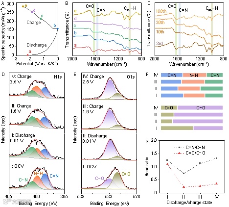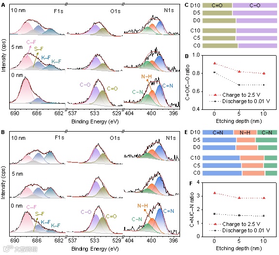 非原位FT-IR谱显示C=O、C=N峰在储钾时减弱、脱钾时增强。非原位XPS谱呈现钾化/脱钾过程中N1s、O1s峰位演变,量化C=N/C-N、C=O/C-O相对含量的可逆变化,证实双活性位点反应。同时,探究了存在SEI膜的前提下,电极表层与内部化学环境演化,测试经过0-nm、5-nm、10-nm Ar⁺刻蚀电极的F1s、C1s、O1s谱,结果表明无论是否刻蚀,放电态(储钾)的C=O/C-O、C=N/C-N比值均小于充电态(脱钾),验证储钾机制且排除表面组分的干扰。