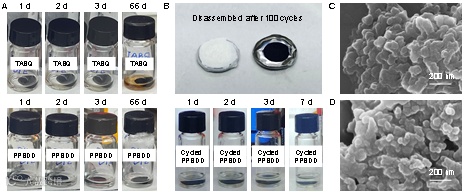 Fig. 6 Evaluations of insolubility and structural stability. Photographs of (A) fresh TABQ and PPBDD electrodes and (B) cycled PPBDD electrode in the diglyme-based electrolyte. SEM images of the PPBDD electrode (C) before and (D) after 100 cycles.