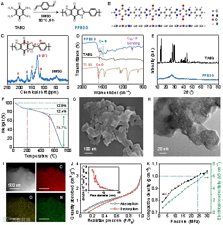 Fig. 1 Characterizations of PPBDD. (A) The synthesis route, (B) typical trimer fragment, and (C) solid-state 13C NMR spectrum of PPBDD. (D) FT-IR spectra of PPBDD, TABQ, and TCBQ. (E) XRD patterns of PPBDD and TABQ. (F) TG curve under an air atmosphere, (G, H) SEM and TEM images, (I) EDS elemental mapping, (J) N2 adsorption-desorption isotherm (pore-size distribution as an inset), and (K) evolution curves of compressed density and electrical conductivity of PPBDD.