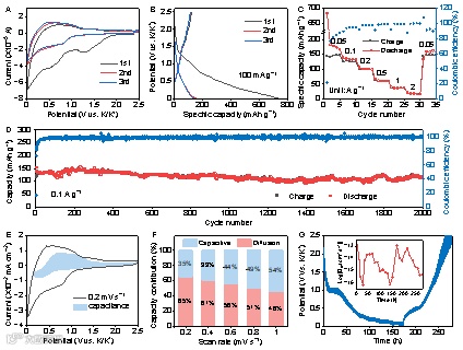 CV和恒电流充放电曲线证实了两步储钾过程。尽管PPBDD电极在高电流密度下极化显著,导致容量衰减;但电流密度从2 A g−1恢复到0.05 A g−1后,容量保持率在100%左右。在100 mA g−1下,2000次循环后的可逆比容量为120 mAh g−1,相对于首圈的容量保持率为98.4%。GITT曲线同样体现出烯醇化和配位两个阶段的储钾过程。