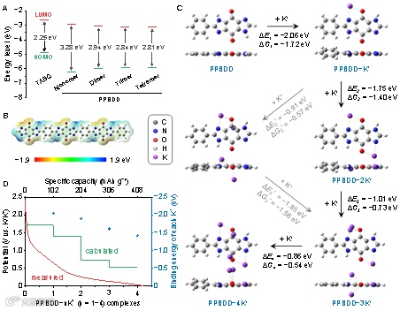 通过DFT计算,随着聚合度的增加,PPBDD带隙趋近2.81 eV;C=N和C=O末端表现出较高电子云强度,为储钾位点。ΔE和ΔG分析表明,首先发生对位羰基的烯醇化(2个K+优先与C=O反应,形成C-O-K键),进一步配位咪唑环中C=N键(2个K+与N原子的不成对电子配位,形成C-O-K-N-C五元共轭环)。理论计算与实测电位曲线,表明PPBDD四电子储钾机理。