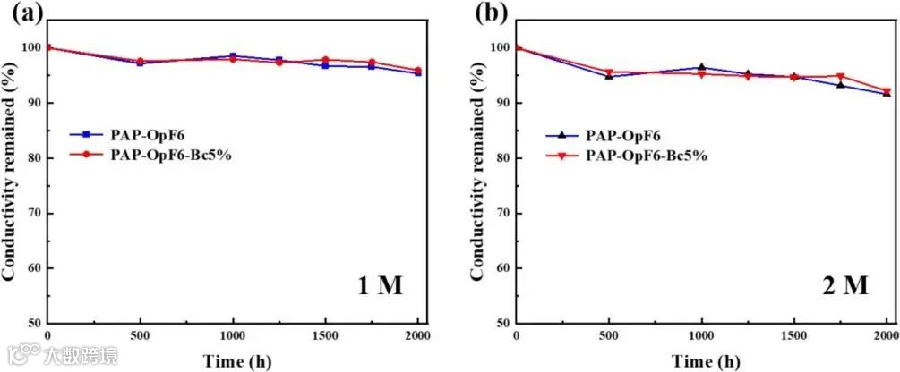 图6 (a)和(b)PAP-OpF6和PAP-OpF6-Bc5%在80 ℃下于1 M和2 M的NaOH溶液中暴露不同时间的离子电导率保留率
