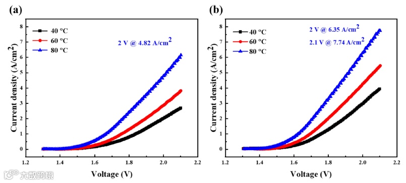 图7 (a) PAP-OpF6和(b)PAP-OpF6-Bc5%膜的电解水极化曲线。膜厚度 40 μm; 正极采用 PFBP粘结剂和 Pt/C催化剂 (1 mg/cm2); 负极采用NiFe催化剂 (2.3 mg/cm2)。