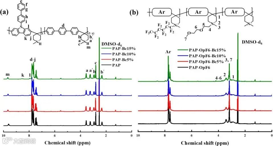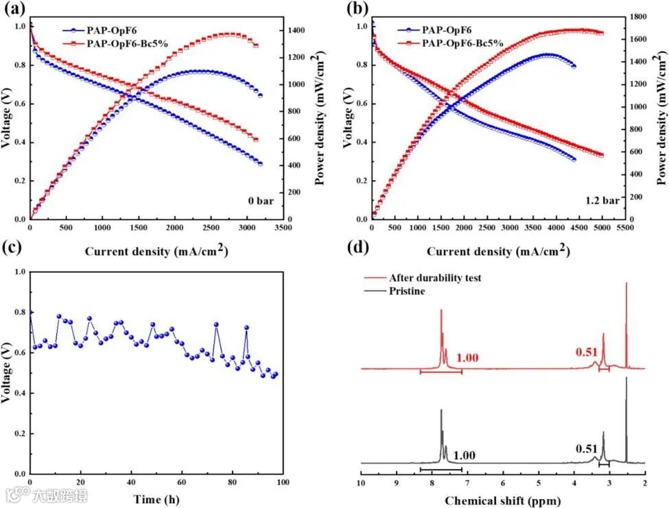 图8 (a)和(b)PAP-OpF6和PAP-OpF6-Bc5%在0 bar和1.2 bar背压下的功率密度曲线;(c)PAP-OpF6-Bc5%燃料电池间歇运行电压稳定性曲线,(d)电池运行100小时前后的核磁谱图
