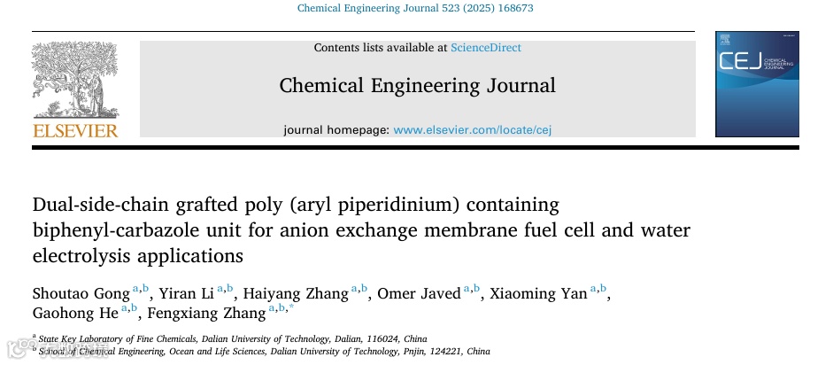 Dual-side-chain grafted poly (aryl piperidinium) containing biphenyl-carbazole unit for anion exchange membrane fuel cell and water electrolysis applications, Chemical Engineering Journal 523 (2025) 168673.