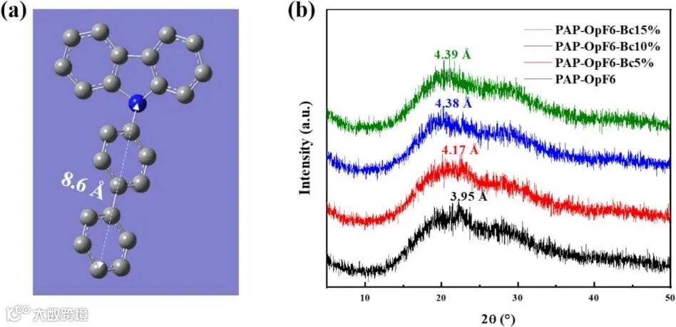 图3 (a)联苯基咔唑的分子构型;(b)PAP-OpF6-Bcx的XRD图像