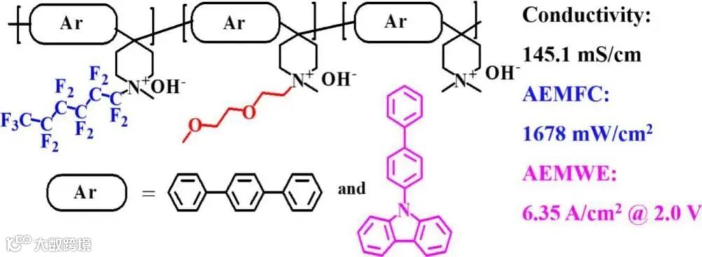 针对上述挑战,大连理工大学张凤祥教授团队在《Chemical Engineering Journal》上发表了题为“Dual-side-chain grafted poly (aryl piperidinium) containing biphenyl-carbazole unit for anion exchange membrane fuel cell and water electrolysis applications”的研究论文。该研究创新性地将刚性联苯基咔唑单元引入聚芳基哌啶主链,并同步接枝全氟化疏水侧链与含醚键亲水侧链,构建了一种具有“刚性主链+双功能侧链”协同作用的新型AEM。
