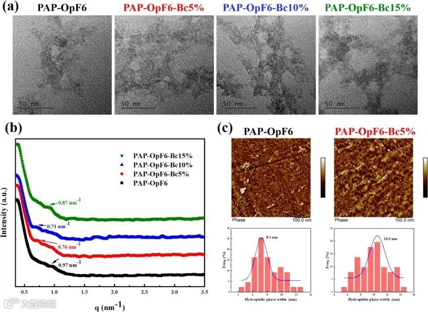 图4 (a) PAP-OpF6-Bcx膜的TEM图像; (b) PAP-OpF6-Bcx膜的SAXS图像;(c) PAP-OpF6和PAP-OpF6-Bc5%膜的AFM图像