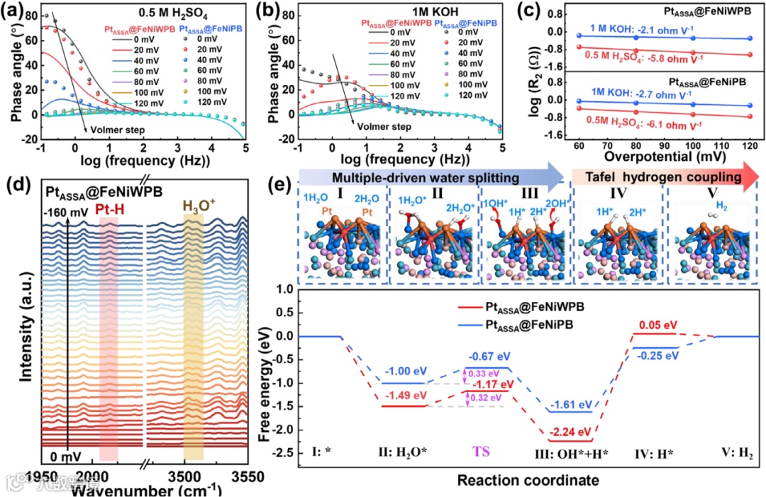 图4原位表征结合DFT理论计算揭示了催化反应机制。EIS分析显示PtASSA@FeNiWPB在反应过程中具有较低的氢吸附阻力与更快的电荷转移动力学。原位ATR-FTIR谱图中在3525 cm-1与2017 cm-1处分别观察到H₃O+与Pt-H⁺的特征吸收峰,证实了水分子在催化剂表面高效解离与氢中间体的快速形成与转化。理论计算进一步表明,W的引入不仅提高了H2O分子的吸附能,还显著降低了水解离能垒,并通过优化Pt位点的d带中心与氢吸附自由能,促进了多原子协同的Tafel步骤。