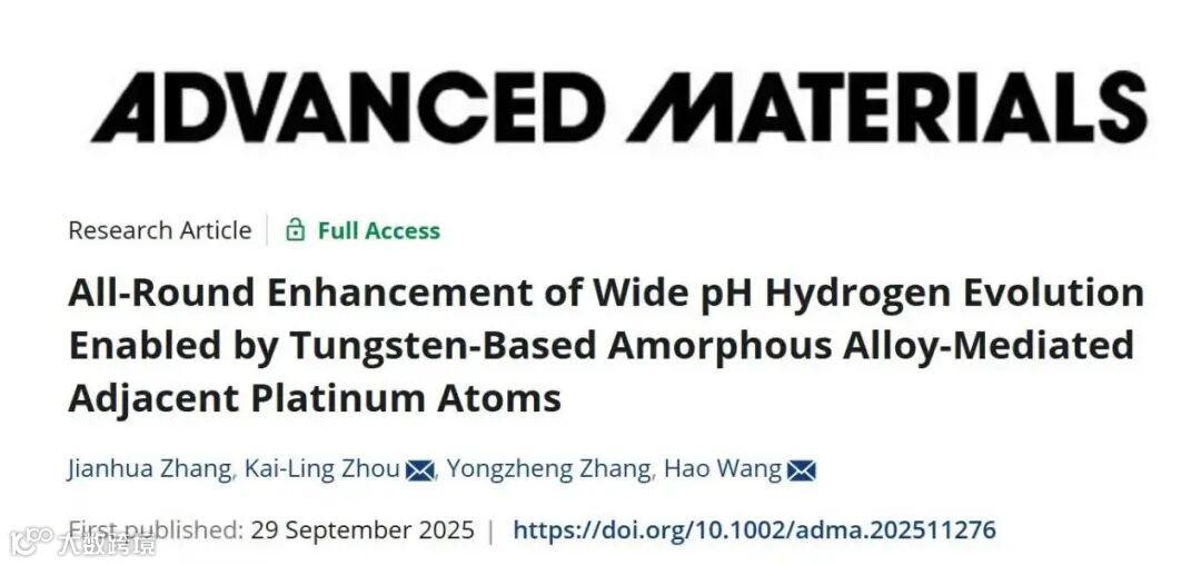 基于此,北京工业大学周开岭、汪浩团队在国际知名期刊《Advanced Materials》上发表题为“All-Round Enhancement of Wide pH Hydrogen Evolution Enabled by Tungsten-Based Amorphous Alloy-Mediated Adjacent Platinum Atoms”的研究论文,团队依托在金属原子结构调控领域的前期研究积累(Adv. Funct. Mater. 2025, 2423476; Appl. Catal. B-Environ., 2024,358:124393; Nat. Commun., 2021, 12:3783),创新性地提出非晶W基合金基底(FeNiWPB)可以为相邻Pt原子的锚定提供丰富的位点(PtASSA@FeNiWPB),通过Pt-载体相互作用在合金表面形成Pt-W/Fe/Ni极化对,诱导电子重新分布使得Pt原子呈富电子态,结合基底对H2O中的H和OH的倾向吸附,加速H2O的解离及H+的还原,并且通过涉及金属-金属协同作用的Tafel步骤促进多个H吸附和转化(Pt1-H+Pt2-H→Pt1-Pt2+H2*)。此外,通过形成稳定的M-W键(M=Pt、Fe、Ni),催化剂的耐腐蚀性显著增强,有效抑制了宽pH范围内的金属浸出,大幅度增强催化剂的稳定性。因此,PtASSA@FeNiWPB在-10 mA cm-2电流密度下表现出超低过电位,酸性介质中为17 mV,碱性介质中为18 mV,其质量活性分别为商业Pt/C的5.8倍(酸性)和63.6倍(碱性)。值得注意的是,该催化剂在酸性和碱性环境中均能保持性能稳定运行600小时,远超无W对照样品(<50小时)及以往报道,使其处于HER性能的前沿。该工作为设计稳定的电催化剂建立了一种普适性策略。博士生张建华为第一作者。这是该团队继2025年9月24日在《Advanced Materials》期刊上发表“Electrochemically Cation-Induced Three-Phase Conversion for Consecutively Tunable Electromagnetic Wave Response”文章之后一周内发表的又一篇工作。