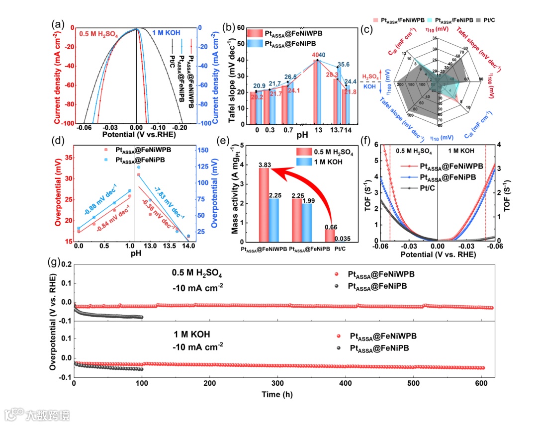图3比较了催化剂在酸性与碱性介质中的电催化性能。在酸性和碱性介质的不同pH条件下,PtASSA@FeNiWPB催化剂在过电位、tafel斜率、质量活性、TOF和稳定性等方面均具有优异的性能。