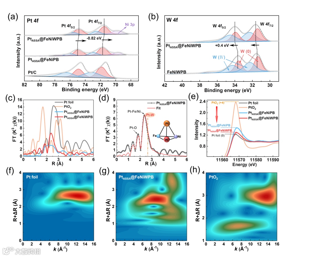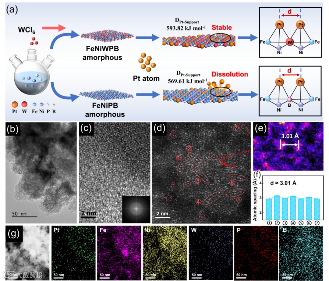 图2通过XPS与X射线吸收精细光谱揭示了W掺杂对Pt电子结构的调控作用。XPS图谱中PtASSA@FeNiWPB的Pt 4f轨道结合能相较于无W样品发生负移,表明W向Pt发生了电子转移,使Pt位点呈现富电子态。EXAFS光谱精确地解析了PtASSA@FeNiWPB结构内Pt单原子的局部配位。XANES光谱揭示了非晶FeNiWPB中相邻Pt原子呈富电子态,说明W的引入使Pt在FeNiWPB中具有富电子的5d轨道占位。小波变换(WT)结果证实了Pt在非晶合金衬底中的单原子分布,且Pt与原子序数较小的金属元素Fe、Ni和W形成配位键。