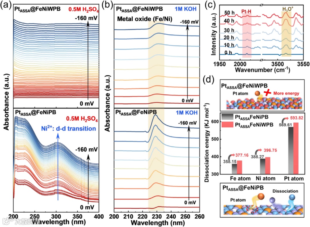 图5原位紫外-可见光谱、ICP与DFT理论计算结合探讨了W对催化剂稳定性的增强机制。在酸性及碱性条件下,无W样品中Ni、Fe等金属元素出现明显溶出,而PtASSA@FeNiWPB则表现出优异的抗溶解性能。理论计算表明,W与Pt、Fe、Ni之间形成的强M-W键显著提高了金属原子的解离能,这表明W的引入直接增强了Pt与基底之间的相互作用,从而提高了解离能。此外,W的掺入提高了Fe和Ni在衬底中的离解能,间接提高了Pt原子的稳定性,减少了它们在HER过程中迁移或溶解的倾向。