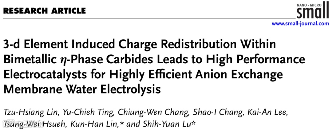 近日,來自國立清華大學的呂世源教授與林昆翰教授合作,在國際知名期刊Small上發表名為” 3-d Element Induced Charge Redistribution Within Bimetallic η-phase Carbides Leads to High Performance Electrocatalysts for Highly Efficient Anion Exchange Membrane Water Electrolysis”的研究文章。該文章開發了雙金屬η相碳化物,並透過3-d元素之變換調控其電子結構,製作出對於HER及OER具有高度活性之電觸媒應用於陰離子交換膜水電解器,並透過臨場X光吸收光譜、臨場拉曼光譜及密度泛函理論計算深入探討其在HER之反應機制與OER過程中之表面重構。