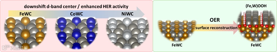 圖1. 3-d元素引入導致的d帶中心下移並提升HER之活性,以及OER過程中所產生之表面重構形成雙金屬羥基氧化物作為OER之活性物質。
