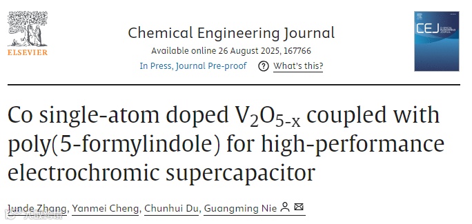 近日,青岛科技大学聂广明教授提出单原子钴掺杂协同聚(5-醛基吲哚)(P5FIn)耦合策略,成功开发出高性能电致变色超级电容器材料P5FIn/Co-V2O5-x。这种电致变色超级电容器(EC-SC)能够通过颜色变化实时反馈储能状态,在智能窗口和可穿戴电子领域展现出巨大潜力。该工作以“Co Single-atom doped V2O5-x coupled with poly(5-formylindole) for high-performance electrochromic supercapacitor”为题发表于《Chemical Engineering Journal》。其构建的EC-SC具有高比电容(241.1 mF cm-2)、实用功率密度和容量密度(1.7 W cm-2和133.94 mWh cm-2),显著的光学对比度(ΔT980 nm=71%)、高着色效率(156.4 cm2 C-1)、快速切换(显色/漂白为4.2 s/4.2 s,红绿黄切换)和长期稳定性(>9000次循环)。解决了传统电致变色超级电容器(EC-SC)的颜色单一、响应迟滞和导电性差等瓶颈问题。该材料在电容、光学调制和循环稳定性方面表现卓越,为下一代智能设备提供了可靠解决方案。