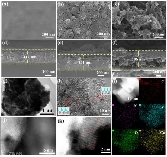 P5FIn/Co-V2O5-x复合薄膜展现出独特的多级结构:SEM和TEM显示,Co掺杂使原始致密V2O5-x表面重构为纳米球形域,P5FIn涂层则形成互连多孔框架,厚度约786 nm。这种结构大幅提升比表面积和离子可及位点。高分辨率TEM证实晶格条纹间距0.697 nm和0.743 nm,对应V2O5的(005)和(110)晶面。AC-HAADF-STEM图像中,孤立亮斑表明Co原子在V2O5-x晶格中均匀分散,EDX映射验证了V、O、Co、C、N元素的均匀分布。