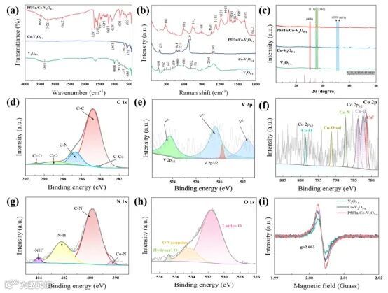 FT-IR和拉曼光谱显示,Co掺杂导致V-O-V伸缩带红移(580 cm-1 - 565 cm-1),而P5FIn修饰使其部分恢复(587 cm-1),表明聚合物与氧化物框架的化学相互作用。XPS分析进一步证实:V 2p谱显示V5+和V4+混合价态,Co 2p谱揭示Co2+/Co3+信号,N 1s区域检测到吡啶氮和Co-N键,说明P5FIn通过醛基与氧空位形成氢键和配位键,增强界面稳定性。EPR测试表明氧空位浓度显著提升,加速离子嵌入/脱出动力学。