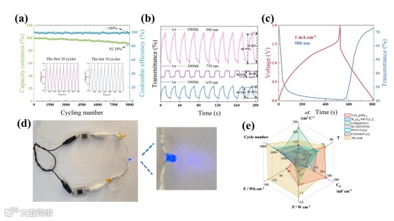 P5FIn/Co-V2O5-x复合材料制备的EC-SC器件在9000次充放电循环后电容保持92.1%,且能同步实现储能状态可视化。实际演示中,串联器件成功点亮LED灯,验证其在可穿戴电子中的实用性。同时,器件在不同温度下也表现出良好的稳定性,能够用支持不同场景下使用。