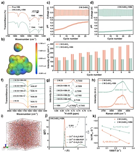 VB6不仅可通过质子化作用缓冲电解液pH值,抑制HER,从而提升电解液稳定性和库仑效率,还可调控电解液中Zn²⁺的溶剂化结构,加速Zn²⁺脱溶剂化。通过FTIR、NMR、Raman等表征手段以及分子动力学模拟,发现VB6可破坏水分子间氢键并部分取代水,降低Zn²⁺去溶剂化能垒,从而促进离子迁移。这些结果证实了VB6在调控电解液方面的潜力。