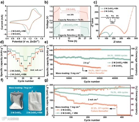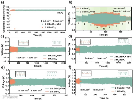 研究进一步验证了VB6电解液添加剂对锌金属负极电化学性能的提升效果。得益于上述VB6对锌负极沉积行为和电解液体系的优化,Zn||Cu半电池在ZnSO4-VB6电解液中实现了高达99.7%的库仑效率。同时,对称电池1 mA cm-2和1 mAh cm-2条件下能够稳定工作超过2100小时。相比之下,未优化的对称电池迅速短路失效。由此可知,VB6能够有效提升锌金属负极稳定性,优化电池性能。