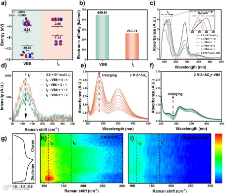 在Zn-I₂电池中,正极充放电过程中生成的易与未还原的I₂结合生成具有高溶解度的,随后引发穿梭效应。在本研究中,VB6因其较强的路易斯酸性,可优先与结合,从而抑制的生成。理论计算表明,VB6具有更低的LUMO能级和更高的电子亲和能,表现出比I₂更强的亲电性,验证了其与之间更强的结合能力。实验方面,原位紫外光谱和原位拉曼测试证实了Zn-I2电池中,VB6在充放电过程中有效降低了的信号强度,进一步验证了其对多碘离子生成的抑制作用。
