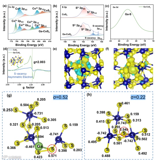 Figure 2. High-resolution XPS spectra of (a) Co 2p, (b) S 2p, and (c) Ga 3d. (d) Electron paramagnetic resonance spectra of pristine CoS2 and Ga-CoS2. Co 2p differential charge density of (e) pristine CoS2 and (f) Ga-CoS2 (cyan represents charge depletion, and yellow represents charge accumulation). The Bader charge numbers of atoms in (g) Ga-CoS2 and (h) pristine CoS2.