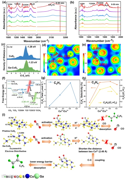 Figure 6. In situ FTIR spectra for the co-adsorption of a mixture of CO2 and H2O vapor on (a) Ga- CoS2 and (b) CoS2. (c) d-band center of CoS2 and Ga-CoS2. ELF model of (d) Ga-CoS2 and (e) CoS2. (f) Gibbs free energy of PCR on CoS2 and Ga-CoS2. The correlation of (g) C2H4 yield, (h) C2H4 selectivity, and C2H4/(C1+C2) with different Co2+/Co3+. (i) Schematic diagram of PCR to C2H4 on Ga-CoS2.