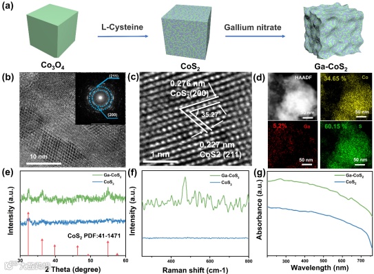 采用两步水热法合成了Ga掺杂的CoS2(Ga-CoS2)纳米立方体,L-半胱氨酸作为硫源。在巯基作用下颗粒表面平衡发生变化,导致轻微团聚,表面粗糙度增加进而增强了光散射与吸收能力。Ga掺杂提升了CoS2的结晶度,有助于抑制载流子复合。值得注意的是,Ga-CoS2的STEM及EDS显示Ga、Co、S元素均匀分布,且未观察到明显的Ga颗粒或第二相,这表明Ga以掺杂形式进入CoS2晶格中,而不是形成独立的金属或氧化物颗粒。紫外-可见吸收光谱显示Ga-CoS2 具有更强的可见光吸收能力。