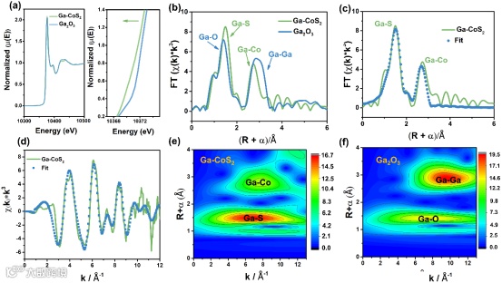 Figure 3. (a) Ga K-edge XANES spectra of the Ga-CoS2 and Ga2O3. (b) Corresponding Fourier-transformed k3-weighted EXAFS spectra of Ga-CoS2 and Ga2O3. Quantitative EXAFS curve fitting in the (c) R space and (d) k space for Ga-CoS2. (e) Wavelet transforms (WT) for the FT k3-weighted 𝜒(k)-function of Ga-CoS2. (f) Wavelet transforms (WT) for the FT k3-weighted 𝜒(k)-function of Ga2O3.