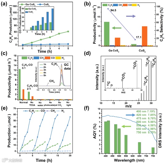 Figure 4. (a) Time dependent conversion yield of CO2 into C2H4 with different samples (the inset is time-dependent conversion yield of CO2 into CO). (b) Selectivity and average yield rates of the conversion of CO2 into C2H4 with Ga-CoS2 and CoS2. (c) Control experiment of photocatalytic CO2 reduction over Ga-CoS2 (the inset is GC data from normal experiment of photocatalytic CO2 reduction to C2H4 and CH4 at varying times). (d) GC−MS spectra of 13C2H4 (the inset is GC−MS spectra of 13CO and 13CO2). (e) Photocatalytic CO2 reduction cycle stability of Ga-CoS2. (f) Wavelength dependence of AQY for the Ga-CoS2.