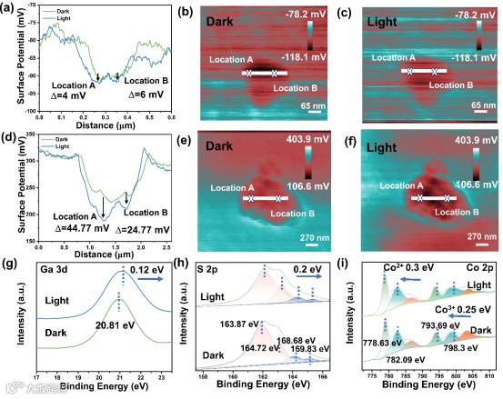 Figure 5. (a) Surface potential of CoS2 under dark and visible light irradiation; Δvalue is defined as the difference between the potential of the samples under dark conditions and the potential under visible light irradiation. SPV responses of pristine CoS2 in the dark (b) and under visible light irradiation (c) conditions. (d) Surface potential of Ga-CoS2 under dark and visible light irradiation; Δvalue is defined as the difference between the potential of the samples under dark conditions and the potential under visible light irradiation. SPV responses of Ga-CoS2 in the dark (e) and under visible light irradiation (f) conditions. In situ irradiated XPS spectrum of Ga-CoS2: (g) Ga 3d, (h) S 2p, and (i) Co 2p.