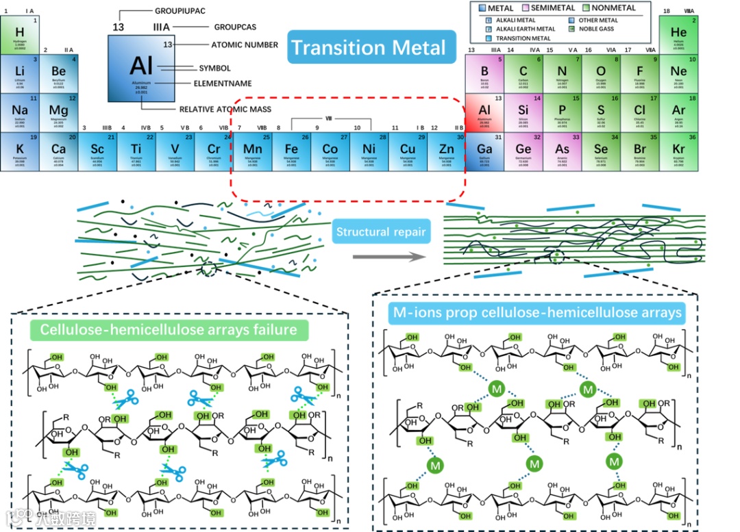图1. 过度金属与铝离子在修复聚集态结构中的作用。
